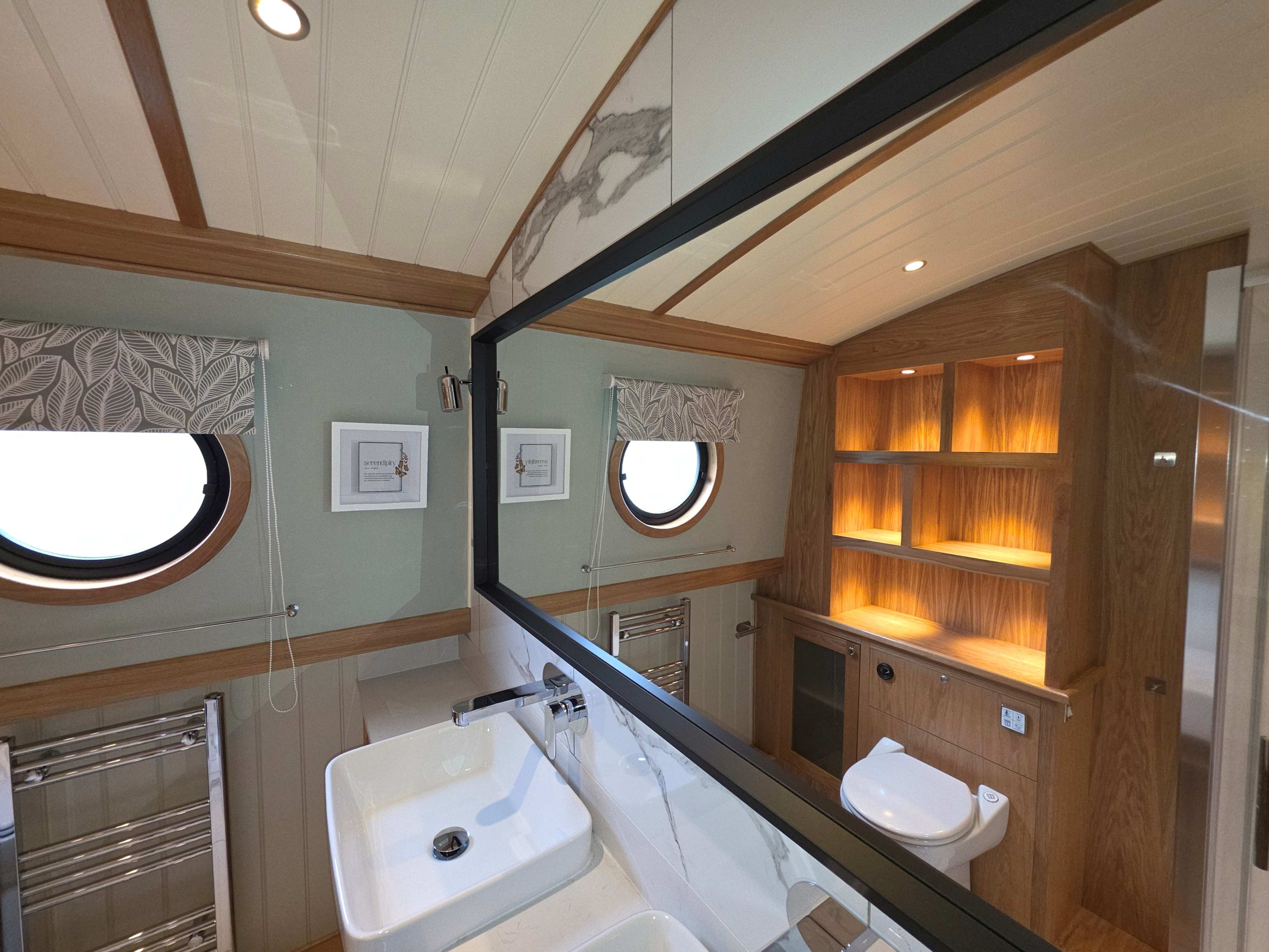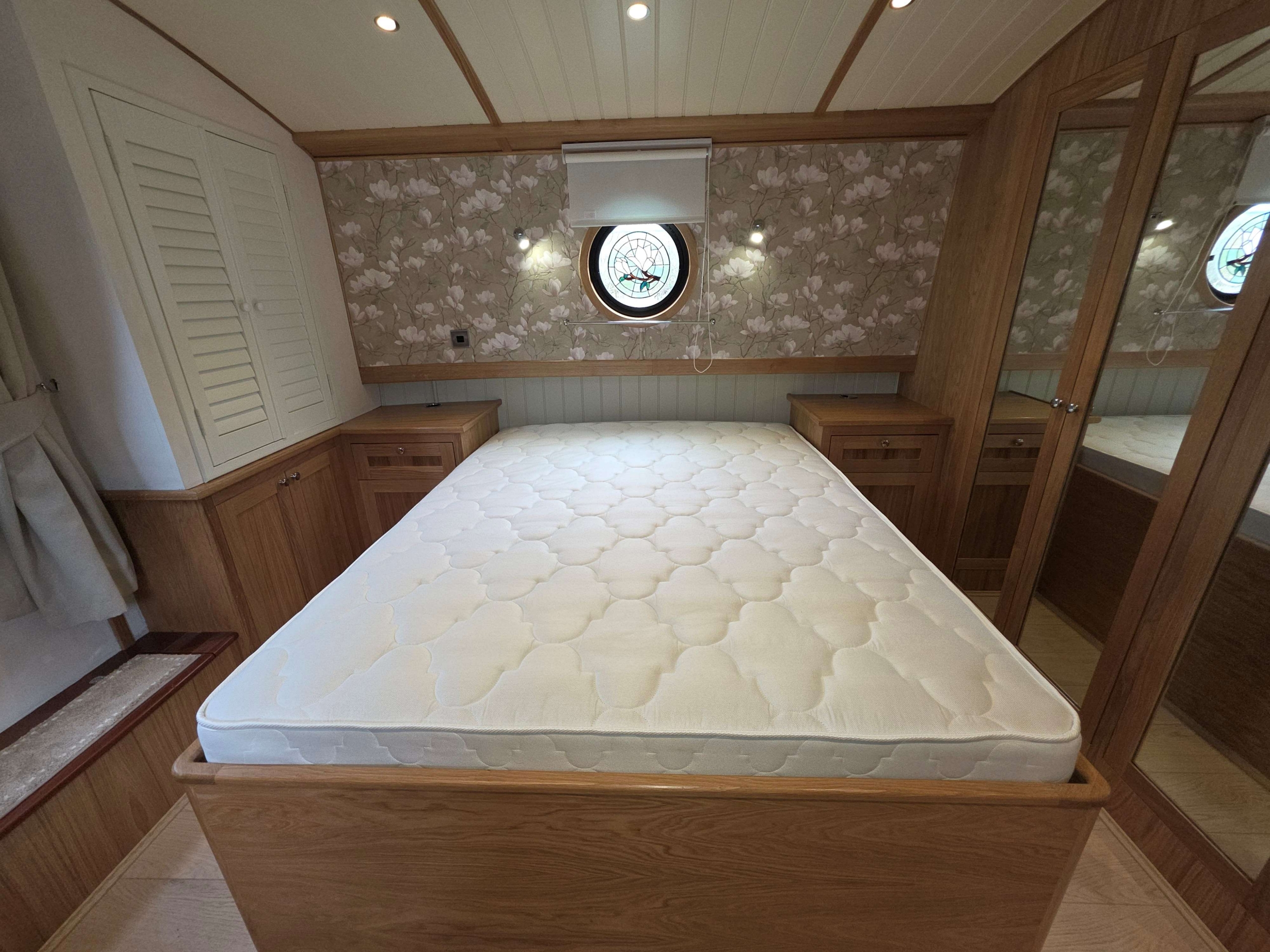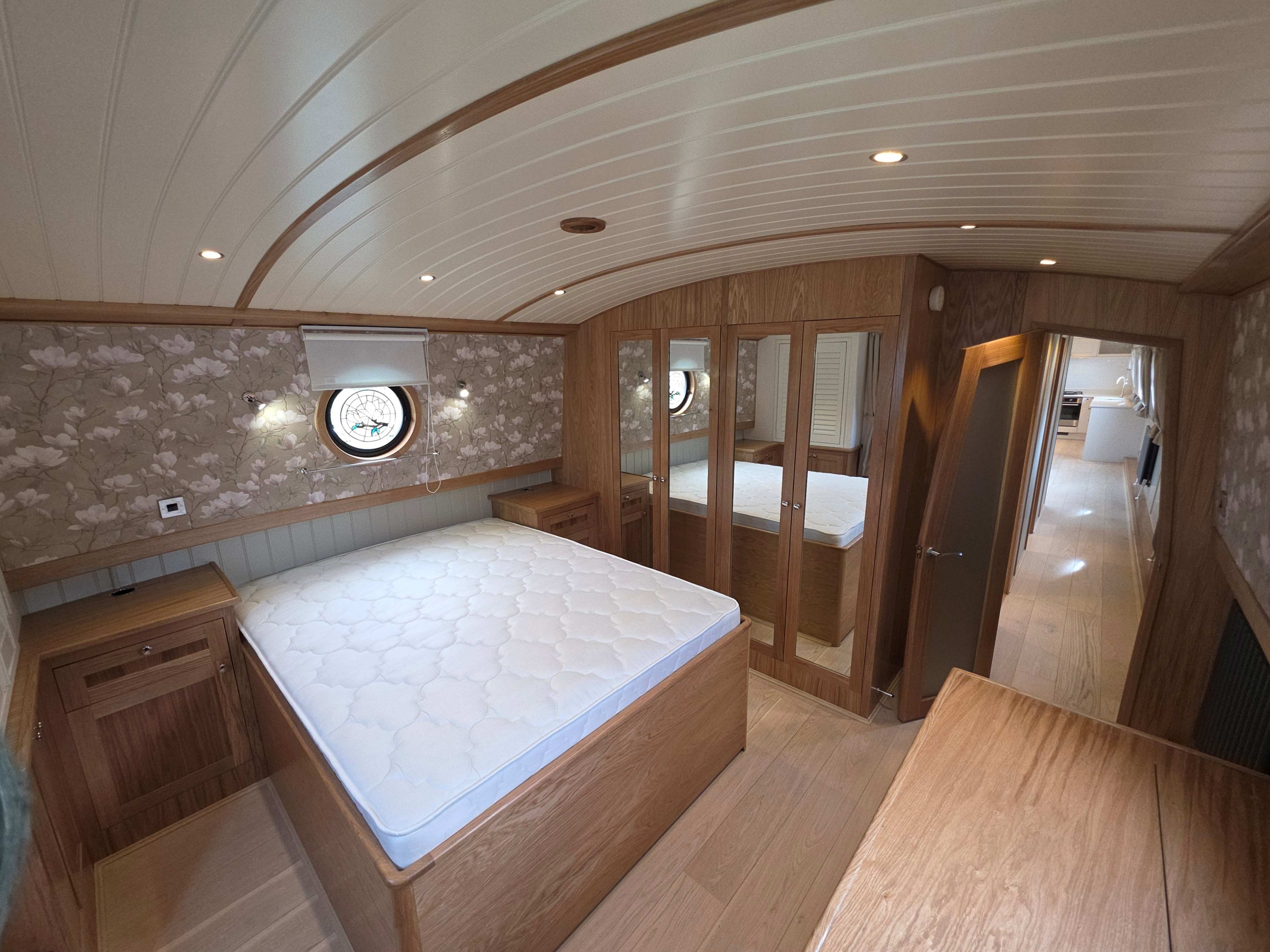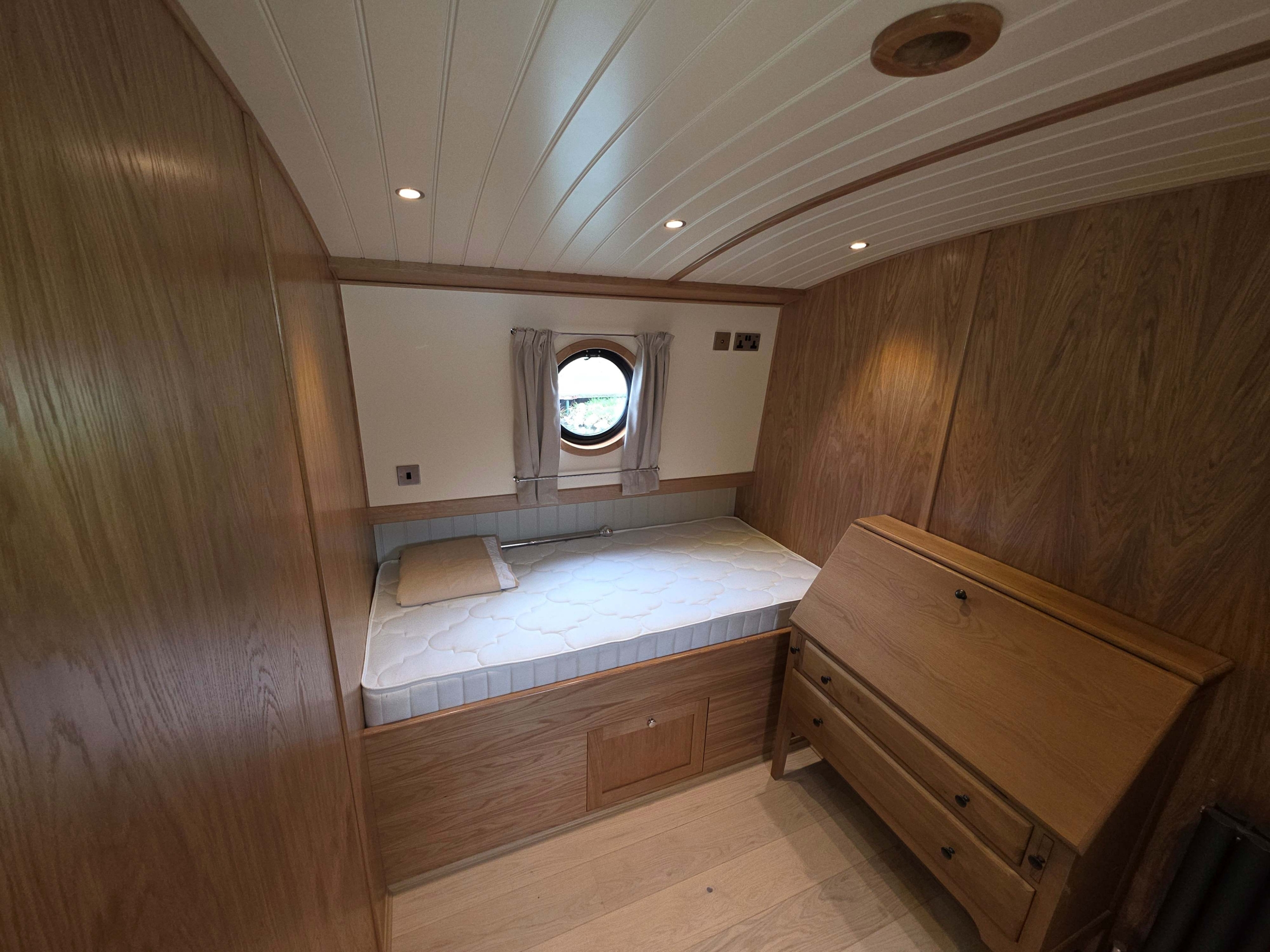 Accommodation comprises, an 8ft rear deck with seating around and canopy above, engine under and gas locker for easy bottle change to the fore, stepping down into Gallery with boat electrical switch controls to Starboard, into the well appointed galley with hob with extractor above and oven under, fridge, dish washer and a washer-dryer , breakfast bar with accent lights above and hatch to starboard, through to the saloon with feature circular skylight above, TV mounted above the multi fuel stove and radiator to the side, through corridor to the second cabin with single bed with storage under, radiator and bureau desk, through corridor to the bathroom, full size shower with his and hers sinks, a pump out toilet and heated towel rail, through to master cabin with King size bed with storage under and reading lights at the head, dressing table with ottoman, a TV that rises out of the dressing table and a radiator through front doors to the bow area with useful fore locker for storage.