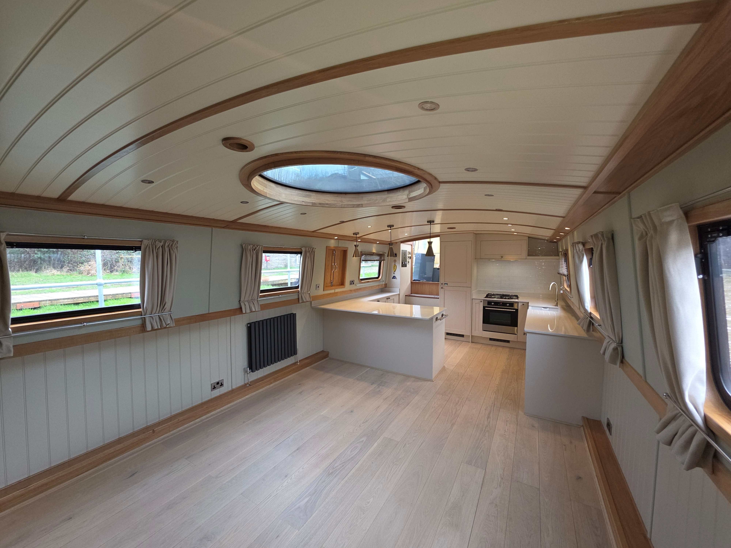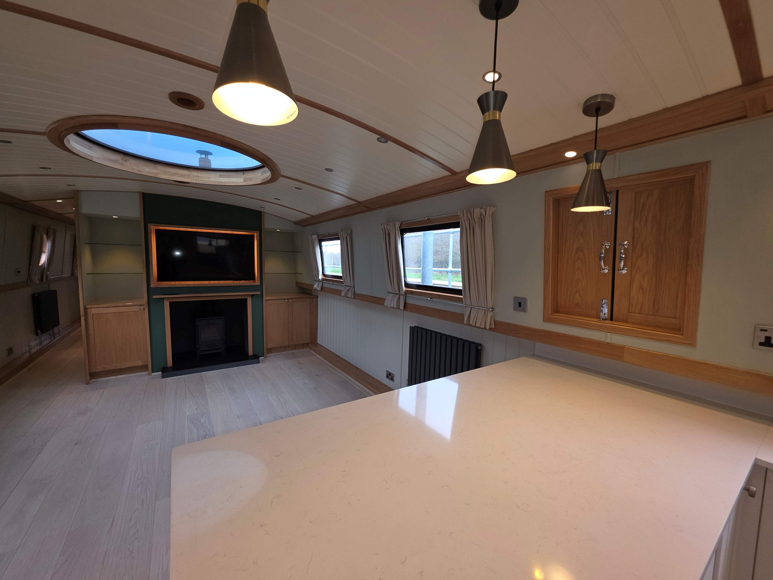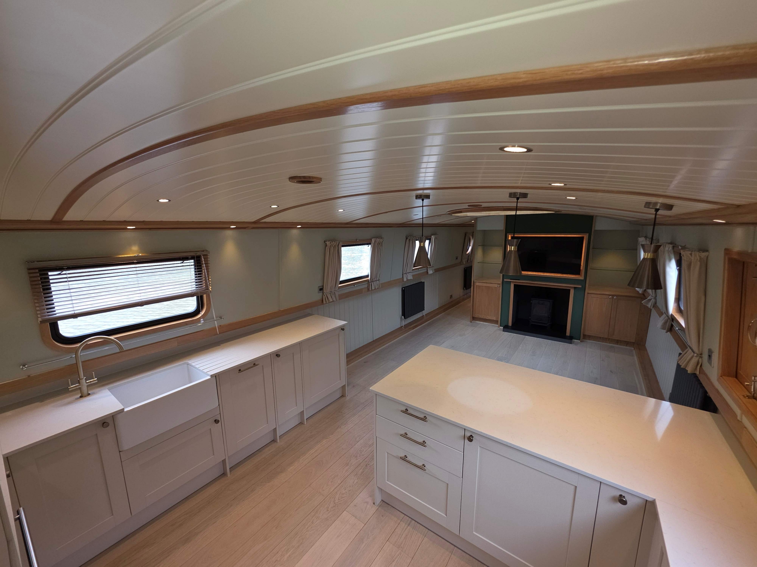 Accommodation comprises, an 8ft rear deck with seating around and canopy above, engine under and gas locker for easy bottle change to the fore, stepping down into Gallery with boat electrical switch controls to Starboard, into the well appointed galley with hob with extractor above and oven under, fridge, dish washer and a washer-dryer , breakfast bar with accent lights above and hatch to starboard, through to the saloon with feature circular skylight above, TV mounted above the multi fuel stove and radiator to the side, through corridor to the second cabin with single bed with storage under, radiator and bureau desk, through corridor to the bathroom, full size shower with his and hers sinks, a pump out toilet and heated towel rail, through to master cabin with King size bed with storage under and reading lights at the head, dressing table with ottoman, a TV that rises out of the dressing table and a radiator through front doors to the bow area with useful fore locker for storage.
