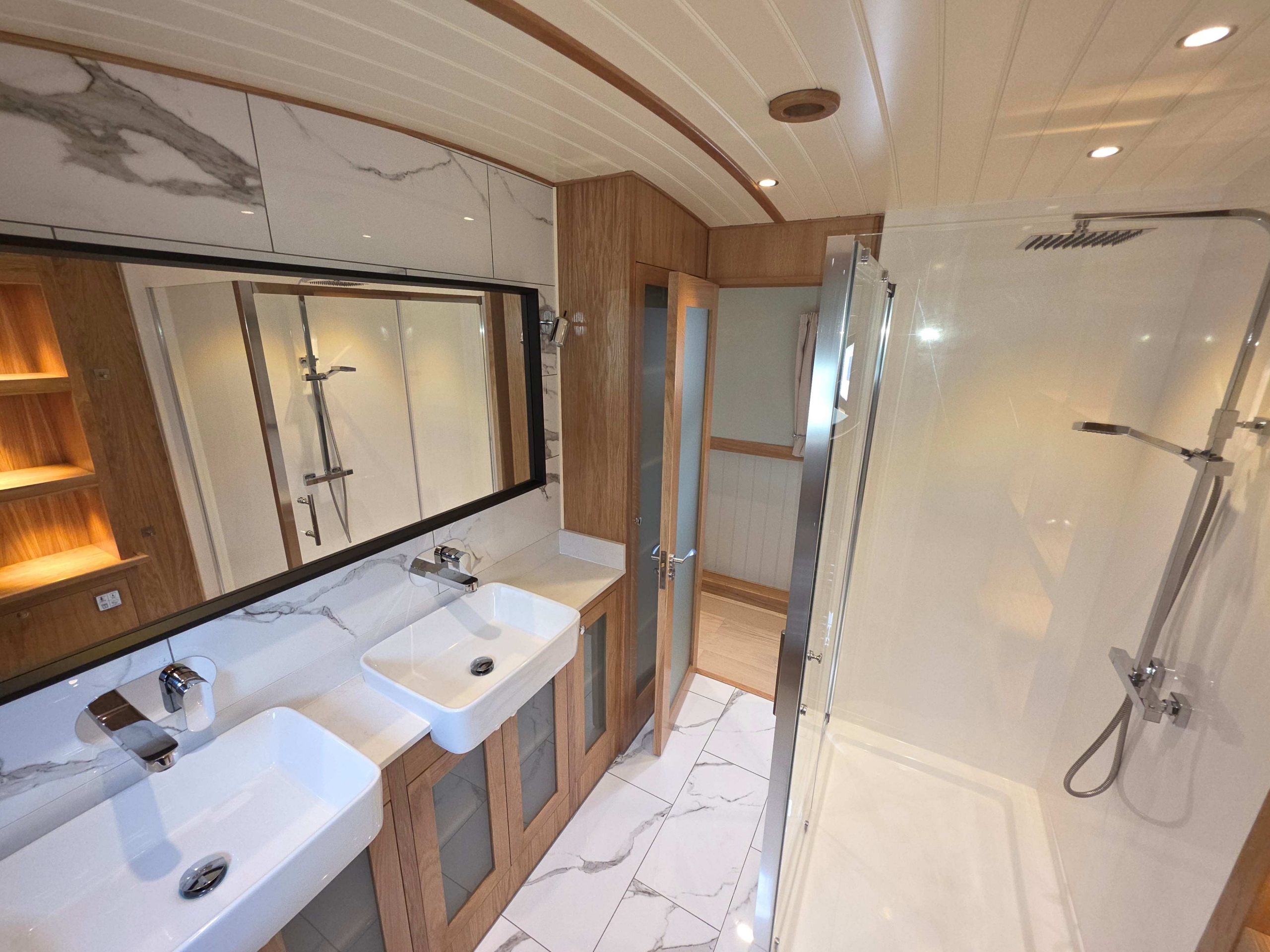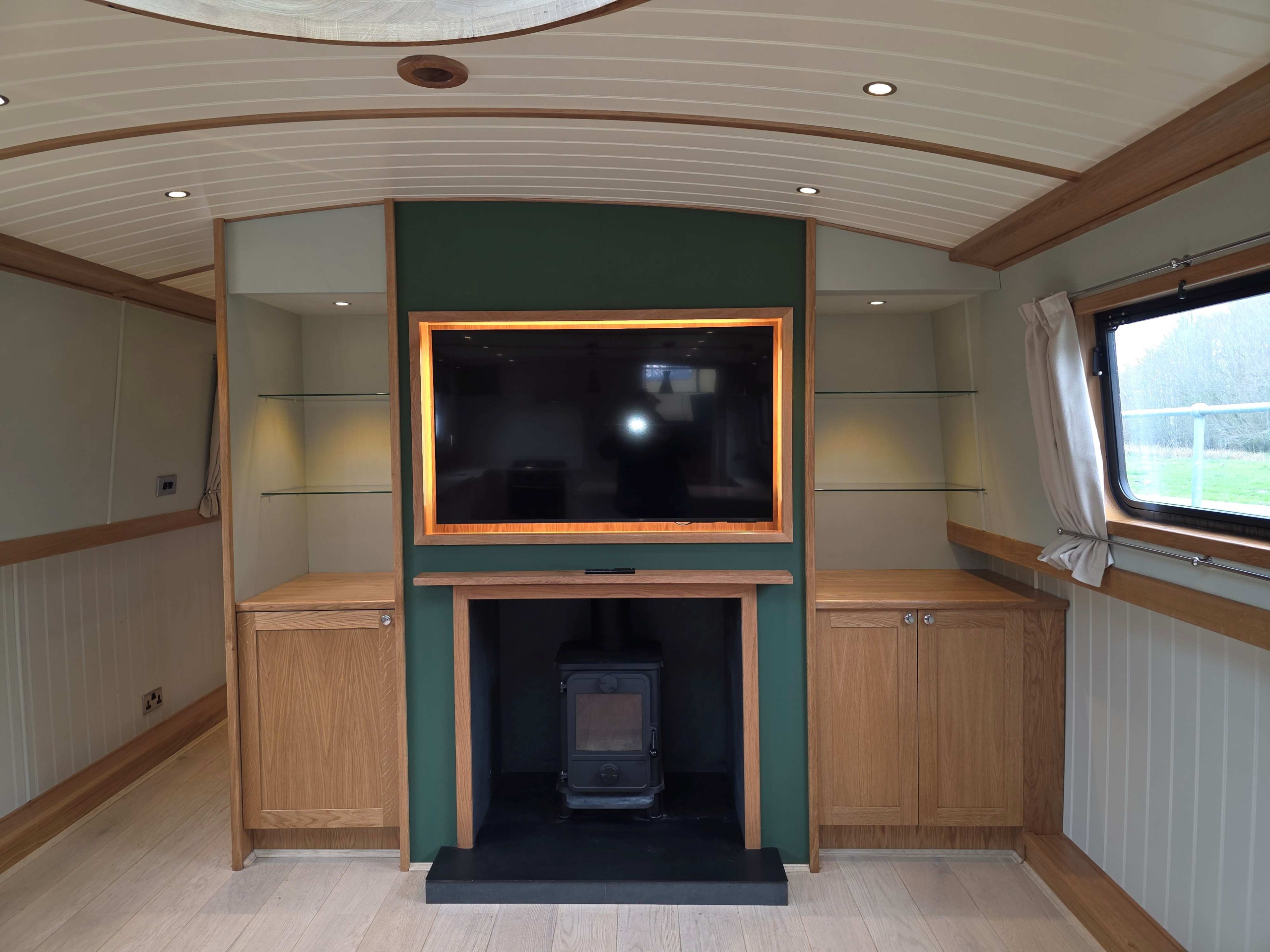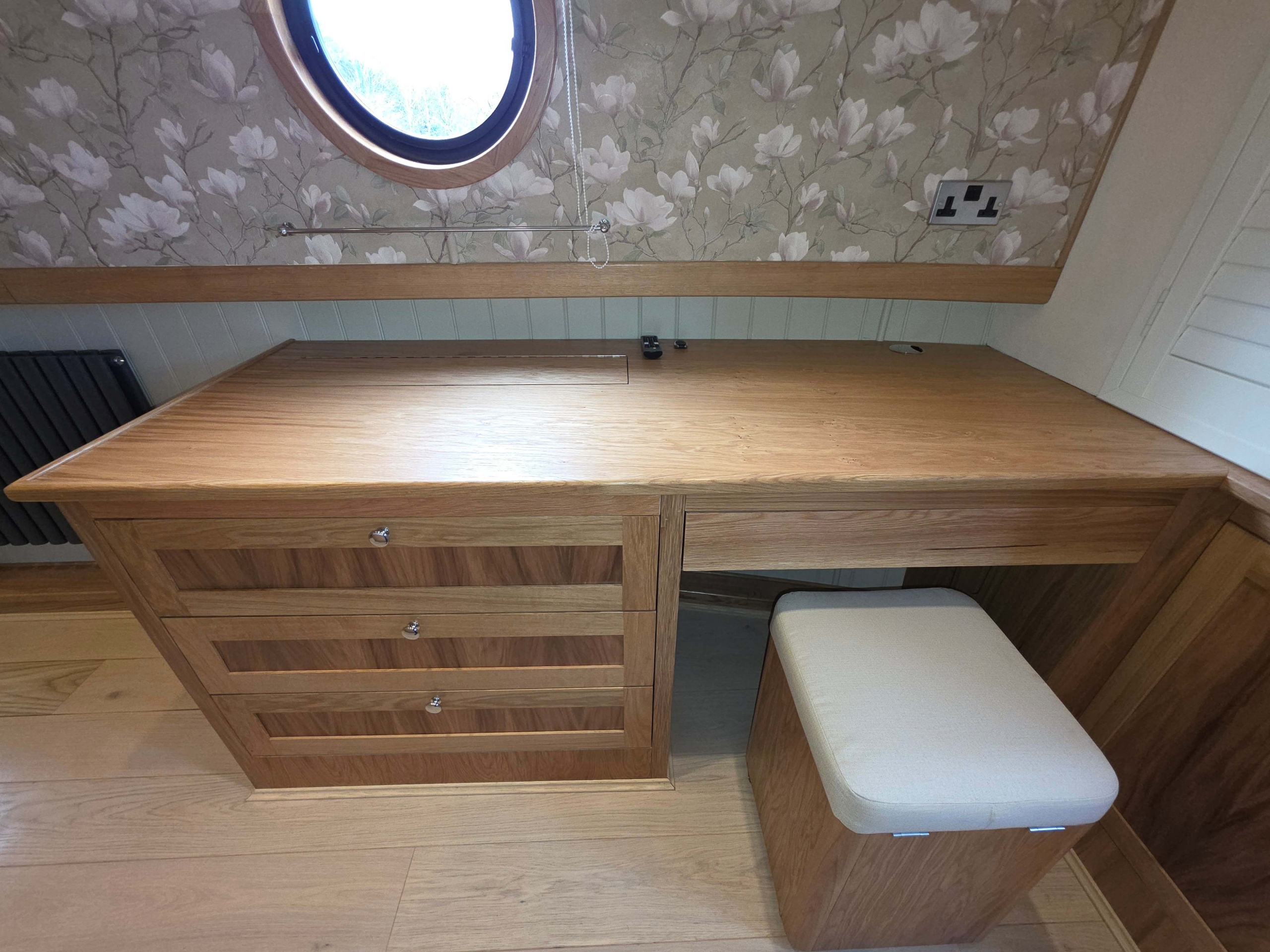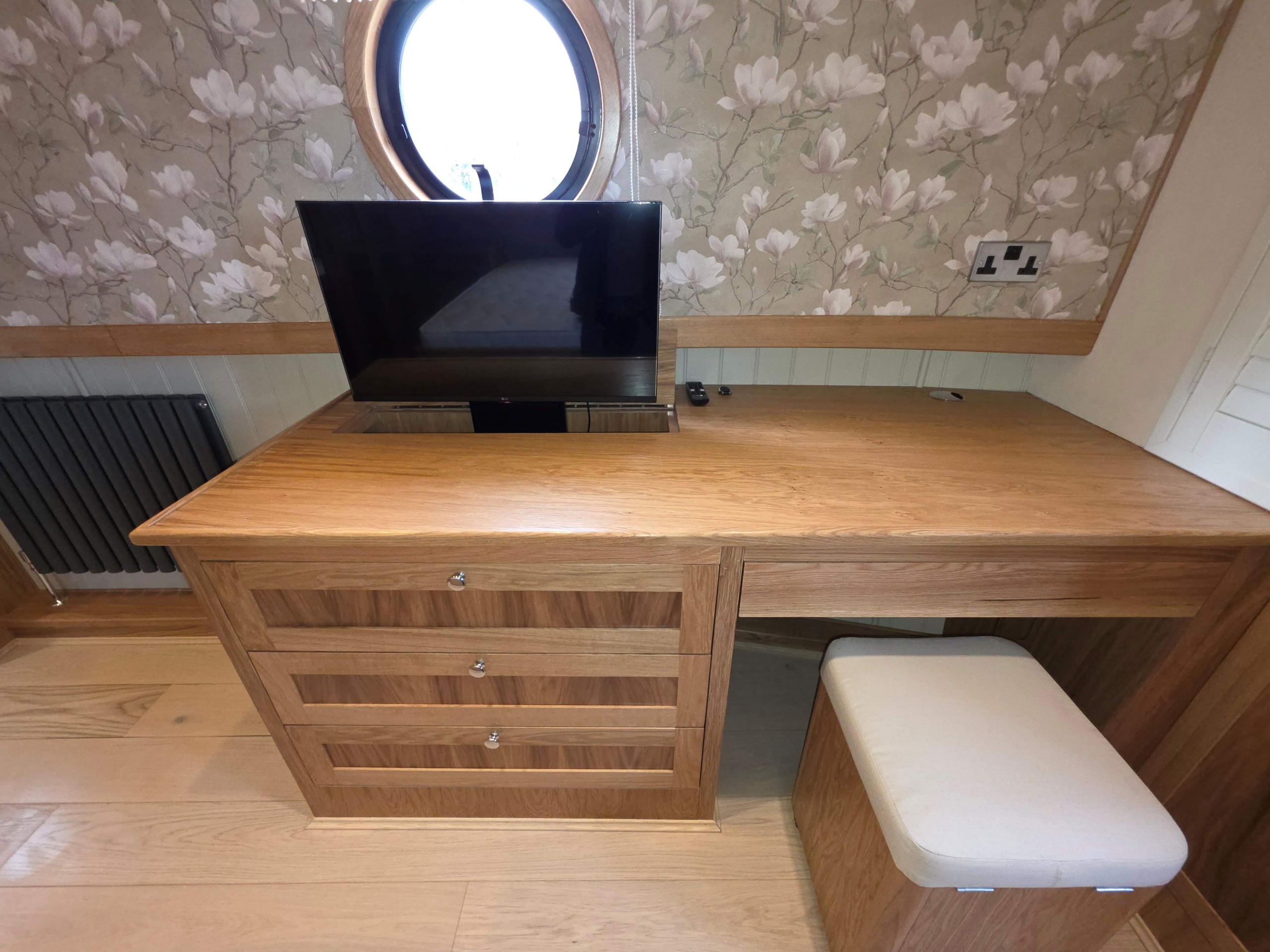 Accommodation comprises, an 8ft rear deck with seating around and canopy above, engine under and gas locker for easy bottle change to the fore, stepping down into Gallery with boat electrical switch controls to Starboard, into the well appointed galley with hob with extractor above and oven under, fridge, dish washer and a washer-dryer , breakfast bar with accent lights above and hatch to starboard, through to the saloon with feature circular skylight above, TV mounted above the multi fuel stove and radiator to the side, through corridor to the second cabin with single bed with storage under, radiator and bureau desk, through corridor to the bathroom, full size shower with his and hers sinks, a pump out toilet and heated towel rail, through to master cabin with King size bed with storage under and reading lights at the head, dressing table with ottoman, a TV that rises out of the dressing table and a radiator through front doors to the bow area with useful fore locker for storage.